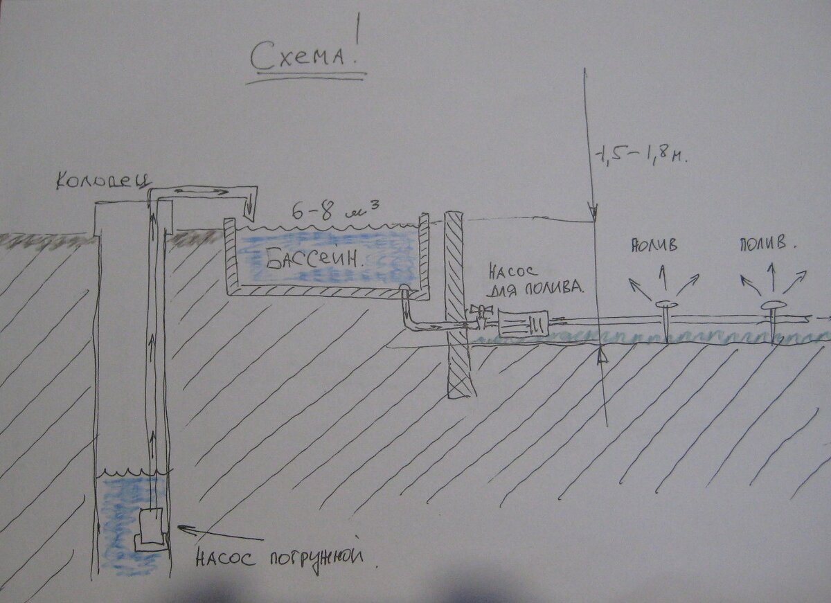 Решил бассейн на участке сделать. Поговорил с несколькими знакомыми и один из них посоветовал вот такой интересный вариант. Мне понравились некоторые его доводы. Немного подумав решил я выложить его план на ваш суд. Благо здесь есть много людей которые приобрели опыт не по наслышке. Буду благодарен за дельный совет, сразу хочу оговориться: я не профессионал строитель. С удовольствием выслушаю дельный совет. Итак вот его рисунок: У меня на участке есть колодец с питьевой водой. Вода на самом деле хорошая. Участок неровный и имеет перепад высот. Вот, что он мне предложил: -Так как ты хочешь сделать бассейн для детей а не для заплывов на дальние дистанции, можно перепад высот использовать с пользой. Вода из колодца попадает в бассейн, нагревается и можно купаться. Ежевечерний полив не будет давать воде застаиваться и зарастать зеленью. Слив из самой нижней точки бассейна обеспечит водой полив через поливной насос . Насос обеспечит нормальное давление для работы 3-4 распрыски