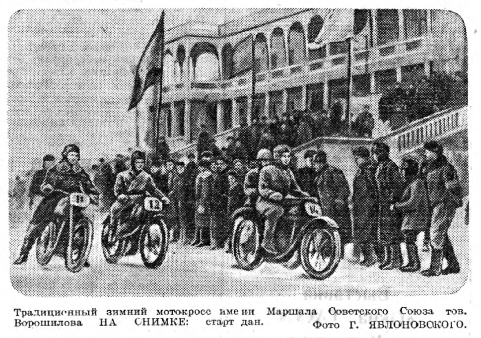 Сегодня под Москвой проводится мотокросс, организованный Военным советом бронетанковых и механизированных войск Красной Армии. К сожалению, мы почти ничего не слышим о проведении подобных кроссов спортивными обществами. Всесоюзный комитет по делам физкультуры и спорта даже теперь, когда мотоцикл блестяще проявил себя на войне, когда, казалось бы, всем ясно значение мотоциклетного спорта для Красной Армии, по-прежнему мало уделяет ему внимания. Сказать, что молодежь не интересуется мотоциклетным спортом, никак нельзя. В свое время на призыв Валерия Чкалова: «Молодежь — на мотоцикл!» — откликнулись тысячи юношей и девушек. Они заставили обратить на себя внимание. Однако руководители физкультурных Организаций очень скоро забросили руководство важнейшим оборонным видом спорта. Юноши, сумевшие стать мотоциклистами, вместе с подготовленными в специальных школах водителями мотоциклов, Принесли большую пользу своей родине в