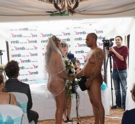 Первыми, официально упомянутыми в масс-медиа эксгибиционистами, которые решились подойти к алтарю, в чем мать родила, являются австралийцы Элла Бартон и Фил Хендикот. Молодожены считают, что «свадьба – это новый период жизни, в который не стоит брать с собой ничего из прошлого, в том числе, и одежду». Во время свадебной церемонии (которая состоялась на глазах у 250 зрителей) из «одежды» на новобрачных были только кольца. Ах да, госпожа Элла решила в последний момент добавить к своему наряду длинную фату и взять свадебный букет из белых роз. А господин Фил прикрыл черным цилиндром … ну вы сами знаете что. После австралийцев, эпатировать окружающих подобным образом, принялись молодожены в разных уголках мира.