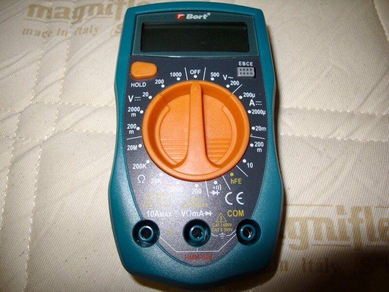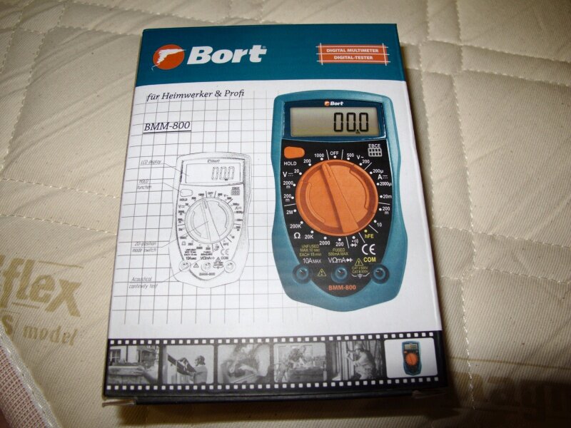 Автор: Юрий Мультиметр от известной международной компании BORT. Покупался для использования в домашних условиях (замерить напряжение в сети, вольтаж батареек и аккумуляторов ну и т.п.). Судя по штрих-коду на упаковке изделия – компания немецкая, но какой-то вразумительной информации это подтверждающей так и не нашел. Упаковка. Поставляется мультиметр в достаточно красочной упаковке из вторсырьевого картона, которая в принципе защищает изделие в процессе транспортировки от незначительных повреждений. На упаковке вы найдете основные характеристики изделия, а также информацию о диапазонах измеряемых значений. Чего-то большего от упаковки мультиметра стоимостью 350 рублей ждать не приходится. Это ведь не пластиковая или металлическая упаковка мультиметра от известного производителя, которая прослужит вам ни один год, но тогда и стоимость будет в несколько раз больше. Комплектация. В упаковке вы найдете сам мультиметр в обычном целлофановом пакетике, измерительные провода и инструкцию