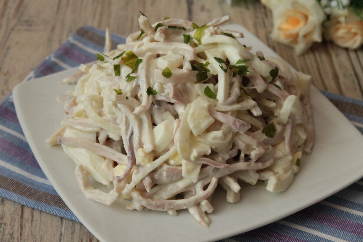 Ещё перед Новым годом мною были куплены кальмары — и как-то всё не доходило до них дело... Сегодня нашла на одном из каналов YouTube очень легкий и простой рецепт салата с кальмарами.