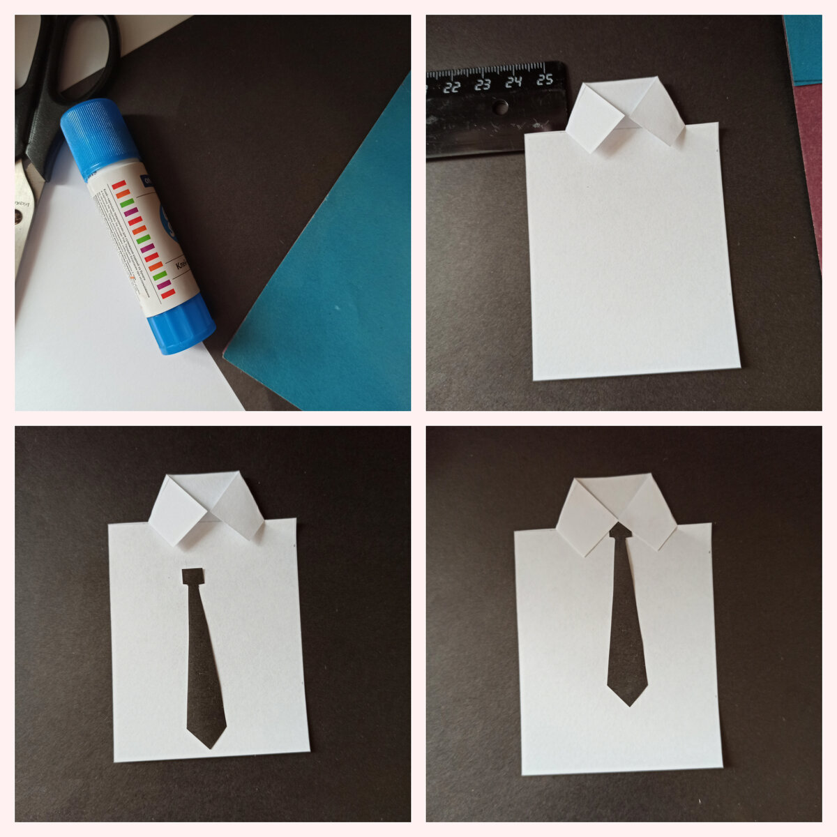 Нам понадобится: - Цветной картон трёх цветов; - Ножницы; - Клей; - Линейка. Открытку делать очень просто, поэтому это отличный вариант поделки с ребёнком для папы или дедушки.