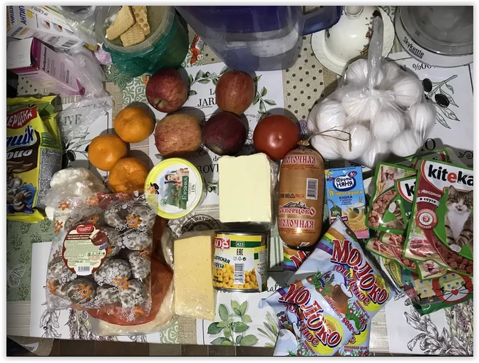 Вроде обычный поход в магазин, ничего особенного не купили, а двух тысяч рублей нет. Так что идею прожить на «прожиточный минимум» сразу отметаем. Сейчас расскажу о том, что мы купили из продуктов, и на что ушло почти две тысячи. Правда из этих денег я примерно 300 рублей положила на счёт интернета, так что непосредственно на продукты ушло 1750 рублей. Итак, я купила: Яйца – 15 штук (100 рублей); Кукуруза в банке – 55 рублей; Корм котам (сухой и в пакетиках) – на 160 рублей; Литр молока – 64 рубля; Сыну питьевую кашу с трубочкой – 115 рублей; Колбаса (маленький батон) – 300 рублей; Сыр (кусочек) – 180 рублей; Масло – 270 рублей; Сметана (в стакане) – 40 рублей; Шарики «Несквик» на завтрак – 65 рублей; Три мандарина и четыре яблока – 150 рублей; Печенье (0,5 кг. «Топлёное молоко» и немного шоколадного) – 120 рублей; Творог (600 граммов) – 100 рублей; Лаваш – 34 рубля. Вот и получается, всего этого хватит дней на три-пять, на завтраки и перекусы. А к этому всё равно ещё нужно добавлять