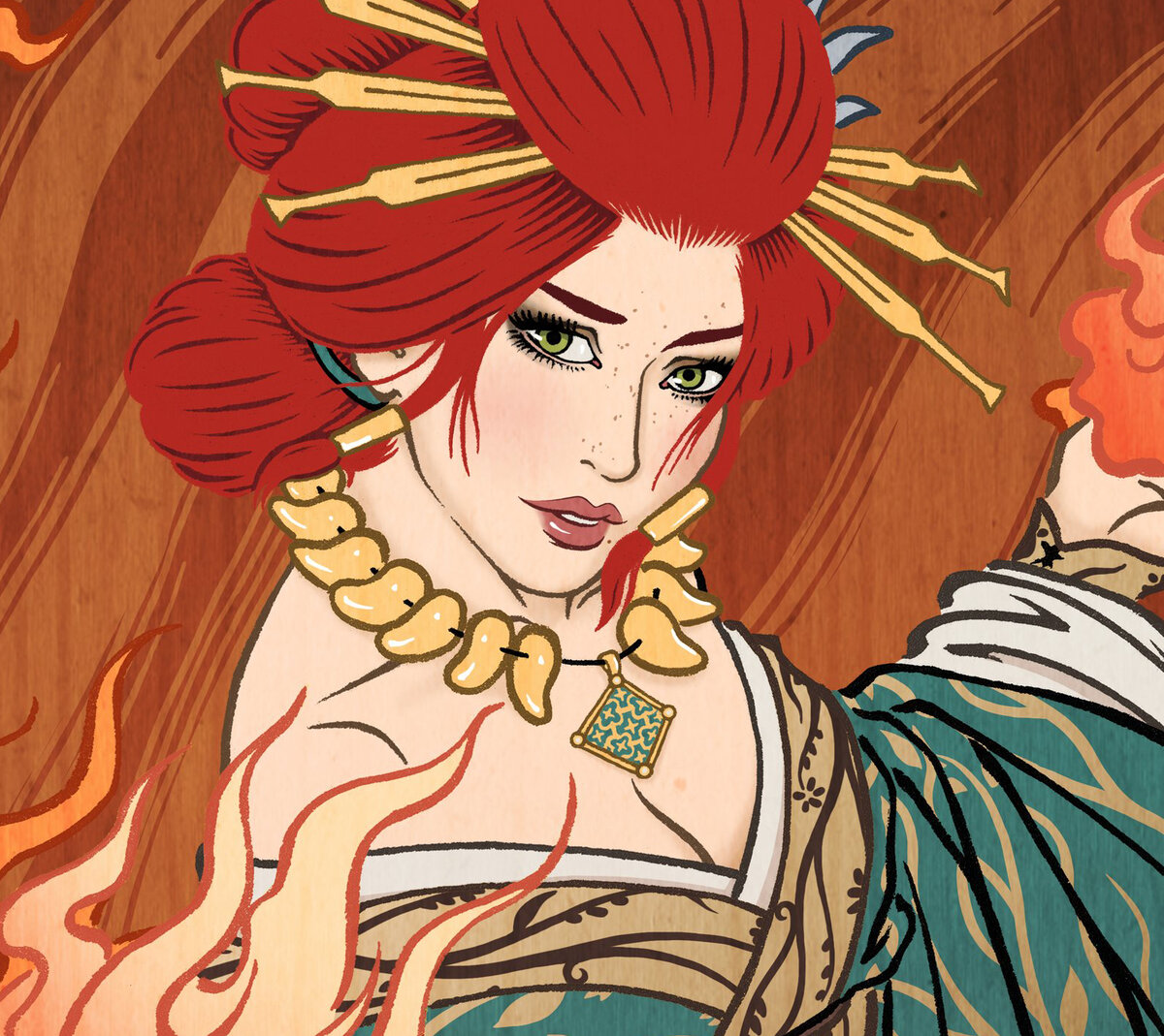 Героев игры «Ведьмак 3» очень любят изображать в различных стилях: от современности до киберпанка. Художник Шон Доннан из Нью-Йорка не смог пройти мимо ярких образов персонажей и нарисовал их на манер японских средневековых гравюр. Своими работами художник поделился в аккаунте Twitter, где также можно найти остальные его арты. Милашка Трисс изображена в кимоно, стилистика которого сильно напоминает платье из третьей части игры. Девушка приняла крайне необычную позу и окружена огнём. Автор, к слову, признался, что больше предпочитает Йен, однако считает Трисс хорошим персонажем. Следом идёт бойкая Цири, наряд которой не сильно отличается от оригинала из игры, хотя и адаптирован под японский стиль. Судя по картинке, девушка бежит от преследующих её призраков Дикой Охоты. Силуэты по бокам намекают на способность Цири моментально перемещаться в пространстве. Выглядит картинка стильно, как и сама девушка с катаной (это, к слову, не первый раз, когда подопечную Геральта изображают в таком в