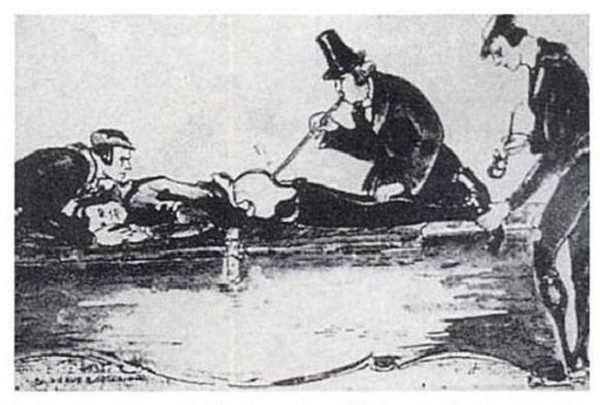 В английском языке существует такое милое выражение "blowing smoke up your arse" (вдувать дым в чью-то задницу). Это означает, что один человек хвалит другого, мягко говоря, не очень искренне (мои московские друзья, в похожих ситуациях, частенько говорят "дуть в попу" - но не важно). Это выражение - оно не просто так появилось на свет. Дело в том, что в конце 1700-х годов врачи в буквальном смысле заполняли дымом прямую кишку своих пациентов. В те времена это была широко распространённая медицинская процедура применяемая при стандартной реанимации. Большей частью - утопленников. И хотя впервые искусственное дыхание стали применять еще древности, но к XVIII веку на искусственную вентиляцию легких уже возлагали не очень большие надежды. Человечеству хотелось прогресса. Новых невероятных прорывов и свершений. Поэтому всем показалось очень интересной идея выловить труп из Темзы и покурить ему в анус. В Лондоне, кстати, оборудование, необходимое для данной процедуры, висело повсеместно на набережных (оно было любезно предоставлено Королевским гуманным обществом). Люди, которые часто отдыхали возле воды, обязаны были знать, где именно располагалось это оборудование и как им пользоваться. Для этого повсеместно проводились мастер-классы с привлечением жителей окрестных домов, которых сгоняли туда отважные лондонские полисмены.