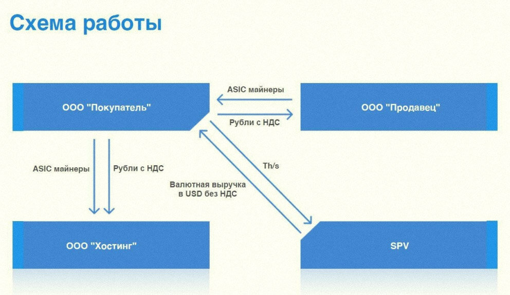 Схема работы сотрудничества между предпринимателем и майнинг-отелем выглядит следующим образом: В итоге юридическое лицо (ООО «Покупатель») получает абсолютно официальный доход на свой расчетный счет, который не облагается НДС, так как это валютная выручка от экспортной деятельности. Таким образом, добыча криптовалют в рамках майнинг-отеля представляет собой оптимальный вариант для юридических лиц, которые получают прибыль от майнинга, но опасаются допустить ошибку при обслуживании всей системы. Читайте так же: Признаки надежного майнинга в дата-центрах Подписывайтесь на канал INTELION MINING: блог о майнинге и криптовалютах INTELION MINING - ваш надежный партнер в сфере майнинга криптовалют
