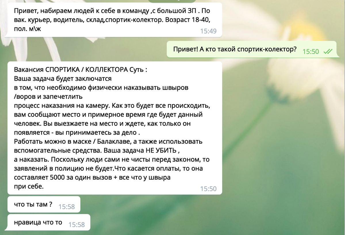 У нас с коллегами есть небольшой чат в Телеграм. Он открытый, то есть его можно найти через поиск. И время от времени в него врываются странные личности, которые предлагают работу. Обычно это простая работенка, не требующая особых навыков: раздавать листовки, грузить что-нибудь, отвезти-привезти. Но сегодня пришел «спамер» с неожиданными вакансиями. Так сегодня я узнал про вакансию «спортик-колектор». По описанию вакансии, вы можете понять, что это околокриминальное. Похоже на миссию в игре GTA San Andreas. Порасшифровав, мы поняли, что речь идет о «закладках». И о людях, которые должны наказывать тех, кто эти закладки ворует. Одни должны бить других и снимать это на камеру. Да еще и получать за это деньги. Спамера мы забанили. Но рассказываю и вам — «спортик-коллектор» (если вам предлагают), то бегите от этого человека, а лучше сообщите об этом в полицию.