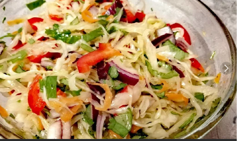 При приготовлении салата из квашеной капусты необходимо выжать из нее сок и обдать горячей водой. Когда вода стечет, нужно уложить капусту в посуду и снова полить выжатым ранее соком.