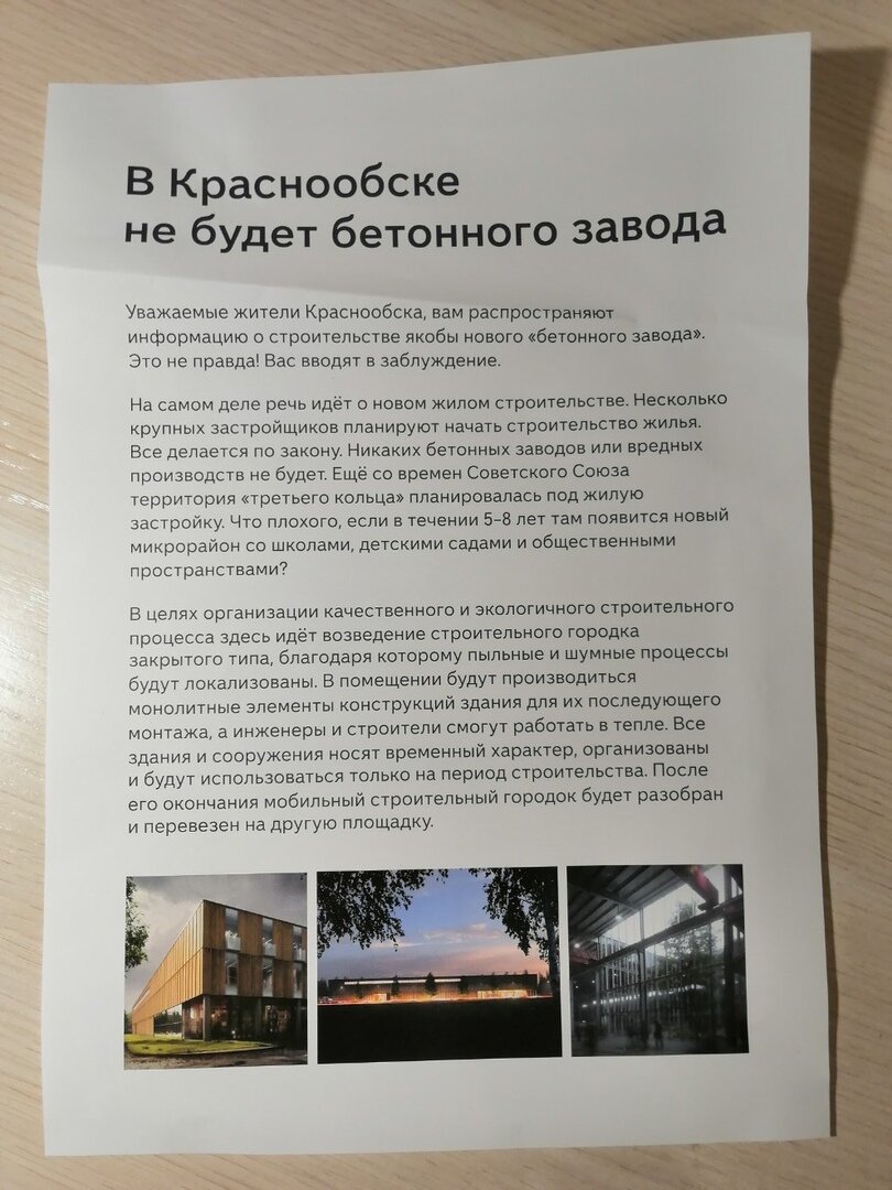 При этом министерство строительства Новосибирской области не увидело нарушений со стороны девелопера. В ответе на обращение председателя инициативной группы краснообцев, ведомство сообщило, что возводимое здание носит статус временного и вспомогательного. Объект возводится в целях обеспечения строительства многоэтажных жилых домов.