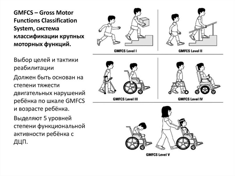 GMFCS - система классификаций больших моторных функций у детей с ДЦП. В основе лежат навыки самостоятельного движения, сидения и хождения. В зависимости от возраста двигательные функции развиваются по-разному. Всего выделяют 5 уровней, где 1 — это легкая степень церебрального паралича.