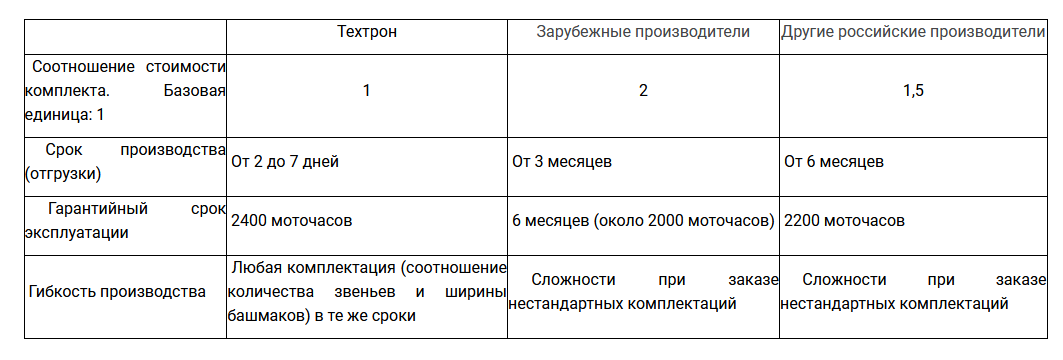 2. Не «переплачиваете» за бренд, таможенные расходы и так далее, так как в стоимость гусеницы включены только расходы на ее производство: стоимость сырья и материалов, заработная плата персонала, участвующего в изготовлении изделия, налоги и минимальная торговая наценка;