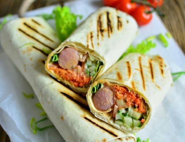 - Обжариваем на среднем огне с двух сторон до появления румяной корочки и все готово. Шаурма с колбасой в домашних условиях получается очень вкусной!
