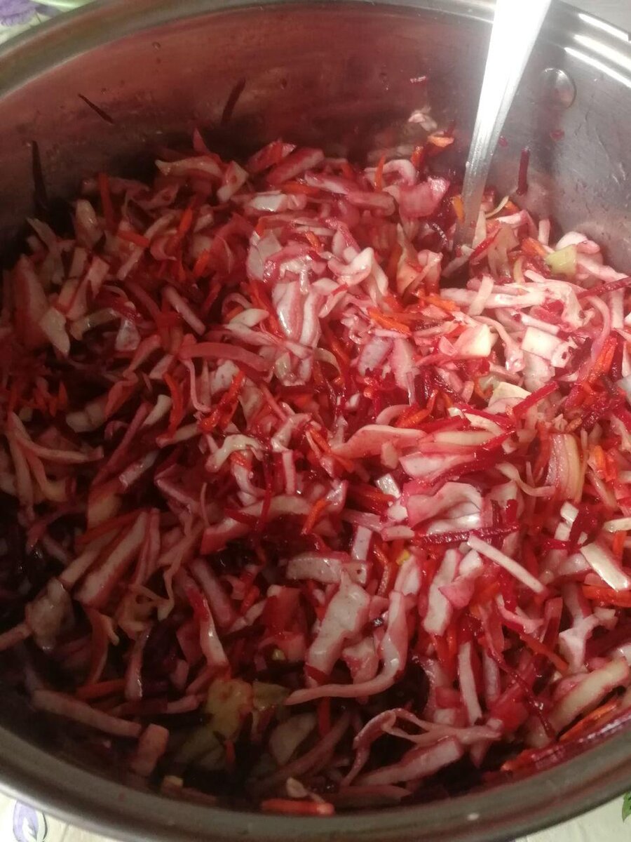 Случайно по телевизору услышала этот рецепт и название. Решила проверить, что за салат такой. З средние свёклины, 3 средние морковины, 2 довольно крупные луковицы и 1 кг капусты-составляющие этого салатика. Тут, как понимаю, всё дело в заправке. Свёклу и морковку запустила в корейскую тёрку, капусту нарезала похоже, тоненькой соломкой. Луковицы- каждую, пополам, половинки на три части и тоже- тоненько. Всё перемешать. Заправка: 2/3 стакана уксуса-6%-го. Теперь понимаю, что можно было взять яблочный. Но- пока уксус обычный: развела эссенцию- на вкус, как мне понравилось, чтобы языку казалось крепковато. Туда же- 1 столовую ложку соли (с маленьким верхом) и 15 кусочков сахара-рафинада (так в рецепте,) я же положила 15 чайных ложечек сахарного песку. Добавить ¾ стакана растительного масла. Вскипятить эту смесь до растворения сахара и соли, облить салатик кипящим и перемешать. Стакан возьмите ёмкостью 250 мл. Оставьте на столе на часок, перемешивая время от времени. Уже на этом этапе оч