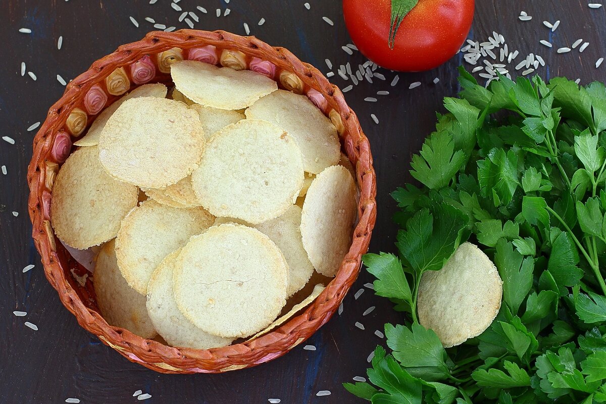 Без консервантов, без ГМО и даже без фритюра - продукт будет подсушиваться в духовке. Рисовые чипсины, приготовленные по базовому рецепту - это хрумкая закуска, которую можно макнуть в любимый соус. Также допустимо поэкспериментировать со специями, тогда даже соус не понадобится. И самое главное! Восток - дело тонкое, рисовые чипсы должны быть еще тоньше! Состав: рисовая мука — 60 г; пшеничная цельнозерновая мука — 60 г; вода — 60 мл; растительное масло — 1 ст. л.; соль — 0,25 ч. л.; кунжут — 2 ст. л.; разрыхлитель — 0,5 ч. л. *У вас нет рисовой муки? Просто пробейте зерна риса блендером или кофемолкой. Приготовление: 1. Просейте оба вида муки. Смешайте их в миске. 2. Насыпьте разрыхлитель, кунжут, соль. Именно сейчас можно добавить специи по вкусу. Перемешайте. 3. В смесь влейте воду и масло. Замесите тесто. Должен получиться плотный, однородный, не липнущий к рукам комок теста. Укройте его и положите на час в холодильник. 4. Раскатайте тесто очень тонко. Пласт должен быть почти п