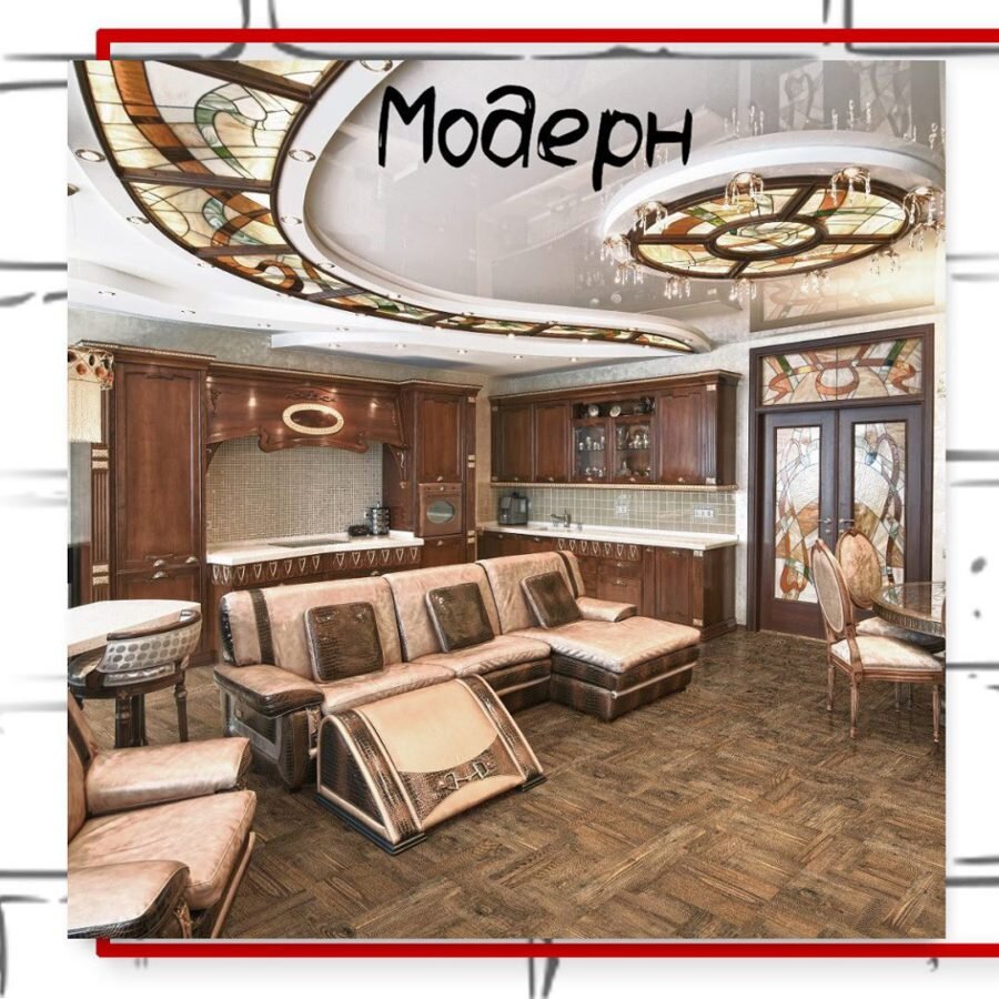 Цвета модерна – жемчужный, небесно-голубой, пепельно-розовый, приглушенно-лавандовый. Текстиль – портьеры и шторы из богатой материи с рисунком из маков, орхидей или павлиньих перьев.