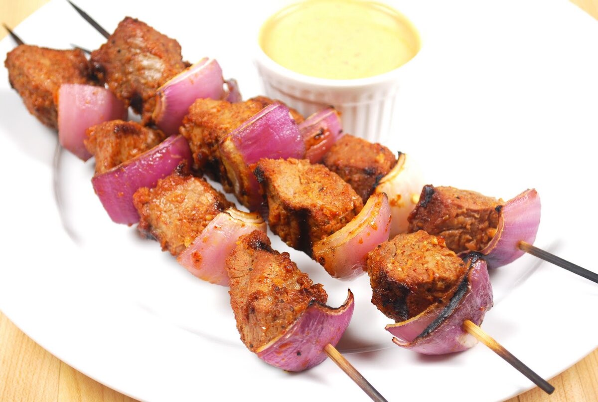 трудно представить себе что - либо более вкусное Подготовка: 20 мин + 3 часа выдержать в маринаде Приготовление: 30 мин На 8 порций: 800 г лопатки ягненка по 500 г сладкого перца и красного лука по 1 ложке рубленой зелени орегано,розмарина и тимьяна Маринад: 3 зубчика чеснока сок 1 лимона 5 столовых ложек оливкового масла соль,черный перец немного кайенского перца(на кончике ножа) Приготовление 1.Продавите зубчики чеснока через пресс. Смешайте их с лимонным соком и 4 ст. ложками масла. Добавьте соль, черный и кайенский перец. 2.Мясо помойте в холодной воде,затем обсушите его и порежьте на кусочки( как для гуляша). Положите мясо в маринад и поставьте миску с ним на 3 часа в холодильник. Время от времени перемешивайте мясо в миске. 3.Очистите сладкий перец и красный лук и порежьте их крупными кубиками. Достаньте мясо из маринада, стряхните остатки маринада и наколите кусочки на шпа