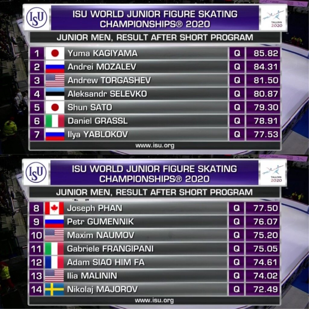 Закончились выступления в короткой программе для юношей. Итоговая таблица выглядит следующим образом: Первым из наших ребят выступал Илья Яблоков. Со своей задачей на сегодня он отлично справился. В КП он исполнил чистенький тройной риттбергер, шикарнейший тройной аксель и каскад тройной лутц-тройной тулуп с небольшими помарками. В целом Илья выглядел очень хорошо. Мне очень нравится его скольжение и постановка программы. Ну а этому блестящему тройному акселю я готова аплодировать стоя, это великолепно! Позже, уже в пятой разминке, на лёд вышел Андрей Мозалёв. Такая музыка, конечно, не может оставить никого равнодушным. И нужно отметить, что Андрей прекрасен в этой программе. Сегодня получился шикарный прокат. Просто идеальные 3 риттбергер, триксель и каскад 3 лутц-3 тулуп. Все на высшем уровне, пусть и с небольшими помарками. Браво, Андрей! В последней разминке свою короткую программу представил Петр Гуменник. Его чистые прокаты на Первенстве очень обнадежили перед чемпионатом мира. О