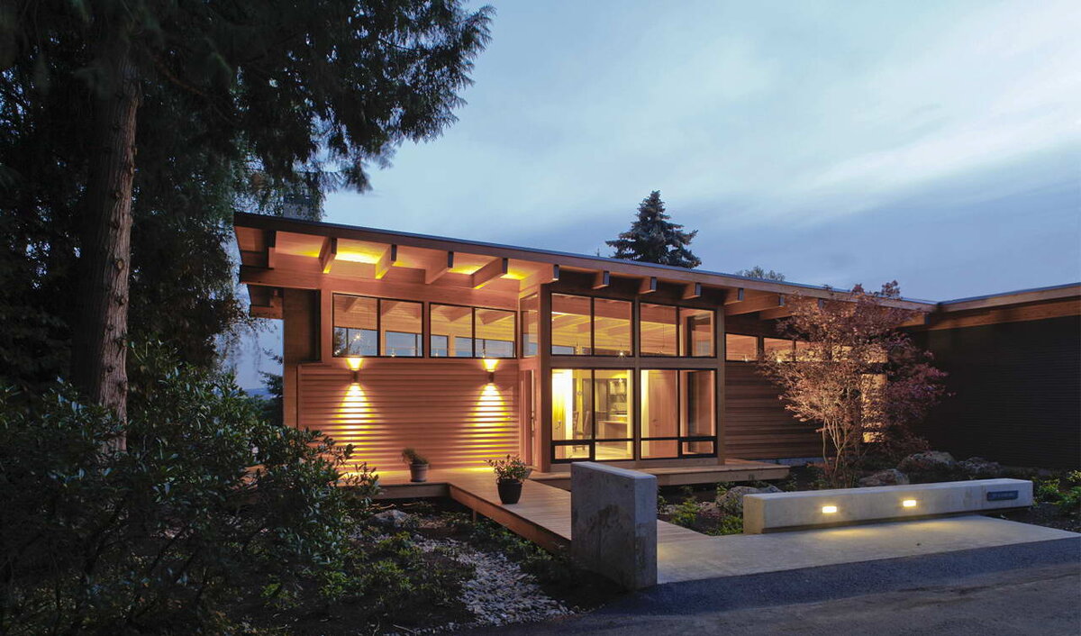 Этот эффектный загородный дом расположен на живописном участке на берегу реки Колумбия с удивительным видом на расположенные вдали горы. Он выполнен в виде лёгкого одноэтажного павильона из дерева и стекла. Архитектура выполнена в характерном стиле американского Северо-Запада, с открытыми деревянными конструкциями, защитой от дождя в тёплый период и захватом зимнего солнца. Односкатная крыша имеет лёгкий наклон вдоль длинной стороны с понижением от общей комнаты к спальне. Название: Резиденция Hotchkiss (Hotchkiss Residence)