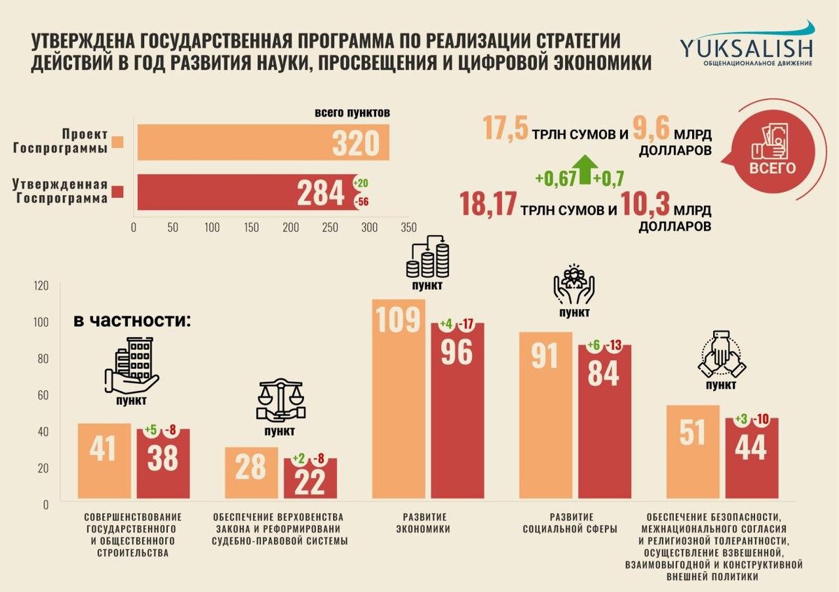 Узбекистан, Ташкент – АН Podrobno.uz. Президент Узбекистана утвердил Государственную программу по реализации Стратегии действий в Год развития науки, просвещения и цифровой экономики, сообщает корреспондент Podrobno.uz со ссылкой на данные движения "Юксалиш". Документ состоит из 284 пунктов. При этом в проекте Госпрограммы было 320 пунктов (минус 56). Программа сократилась по следующим направлениям: – совершенствование государственного и общественного строительства – 38 пунктов (минус 8 пунктов от проекта);