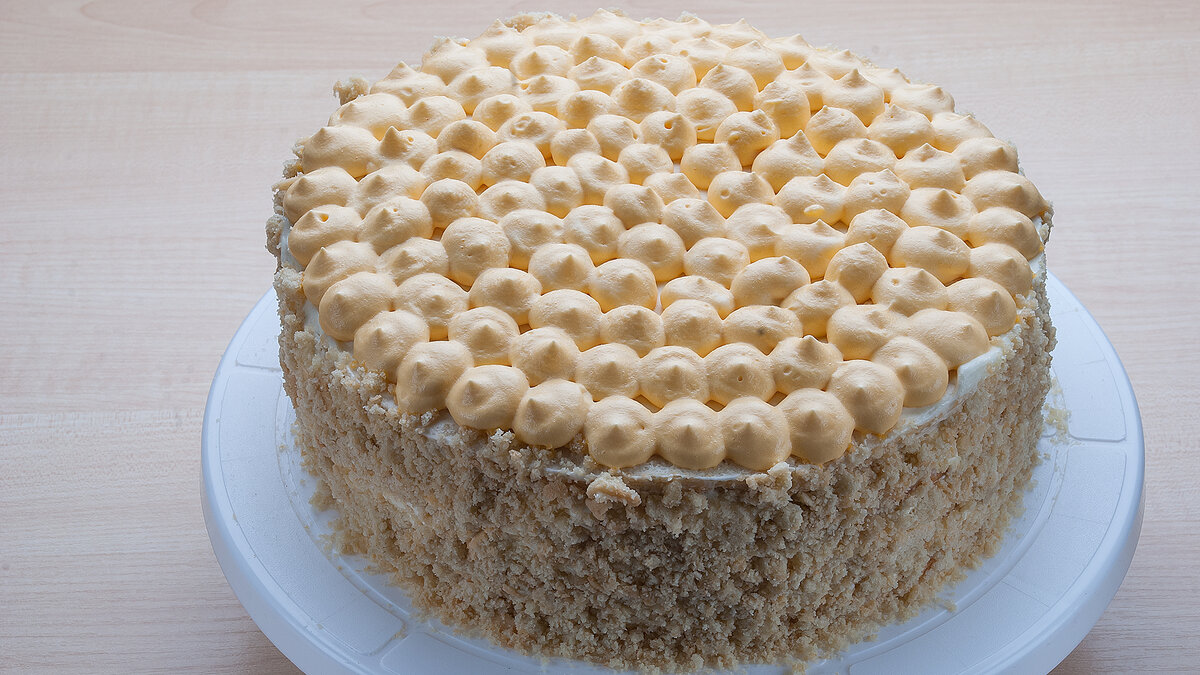 14. Выравниваем торт с помощью крема и посыпаем бока измельченной крошкой
