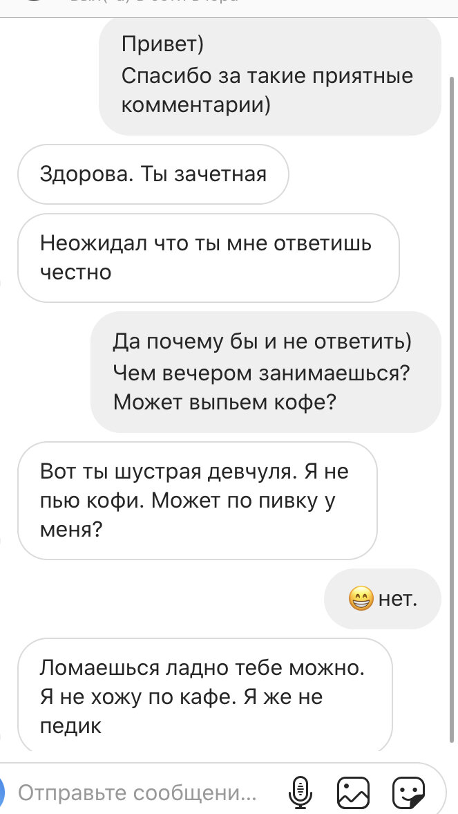 Вот я недавно рассказывала, что писал мне в инсте один пикапер. Называл меня смачной соской и прочее. Я решила не дожидаться от него других шагов и шагнула сама. Слово за слово и я сболтнула, что ездила в одно место сама, за рулем. Он просто намертво вцепился в эту тему. Мол, раз у тебя машина, то зачем нам идти куда-то. «Давай сидеть у тебя в тачке» (с) Мило, романтично и просто невозможно устоять. А у меня эксперимент. 100 свиданий с разными людьми. Пока притянула это. Все равно мне нужно было ехать в его сторону. Заехала. Он доволен был сидеть и у подъезда. Но, уболтал сгонять за пивком в ларек рядом. Ведь он не за рулем. Хе-хе-хе и гы-гы-гы. Меня уже начало подтрясывать. Но не от любовных флюидов вовсе. Сходил в ларек. Принес бутылку пива и сигарет. Себе. А мне? Например-ничего. Сказал, что мне пиво вредно. Нормально так. А шоколадку не судьба было купить? Сидим дальше. Я доехала до его подъезда, чтобы можно было без зазрения совести его подпнуть и уехать. Всю дорогу он сп