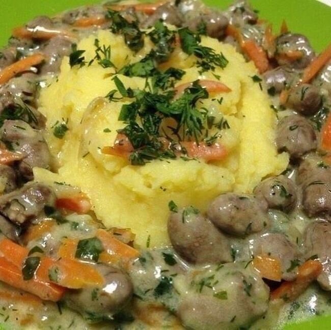 Добавить молоко, рубленую зелень, посолить и поперчить. Добавить муку. Довести до кипения и тушить еще 5 минут. Выключить плиту и дать настояться. Подавать с картофельным пюре.