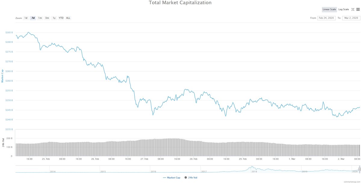 На криптовалютном рынке отмечается консолидация. Амплитуда колебаний краткосрочных циклов снижается, показатели волатильности постепенно приходят к значениям, на которых удельный вес эмоциональной составляющей при принятии торговых решений участниками относительно невысок. Основной индикатор рынка с пятницы снизился на 1,6%, и его значение на данный момент составляет $246 млрд. Наш индикатор BC 10 Index потерял 1,5 % и опустился до значения 153,6 пунктов. Bitcoin Темпы снижения цены на BTC замедлились. За выходные котировки опускались до значения $8500, однако дальнейшего ускорения не последовало. С технической точки зрения, движение сейчас происходит в нисходящем канале на объемах ниже своих средних значений. В случае уверенного пробоя верхней границы торгового канала вероятность смены тенденции существенно возрастет, однако для полного разворота цене необходимо будет закрепиться выше значения $9000 за одну монету. Тем временем, хешрейт BTC достиг рекордных значений. Ethereum За выхо
