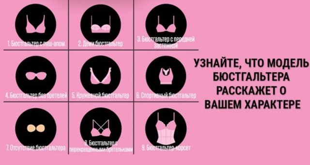 Самый уникальный тест, который сможет определить характер женщины по предпочтению в нижнем белье. Трудно представить, что обычный атрибут гардероба женщины сможет раскрыть самые потайные черты личности девушки. Если Вы мужчина, который хочет лучше узнать свою девушку, предложите пройти этот тест своей даме. Вы сразу узнаете о том, что скрывает от Вас ваша суженная. Для прохождения теста необходимо выбрать один из девяти различных бюстгальтеров. Со стороны это выглядит забавно, но в реале всё это тесно связано с женским подсознанием и характером. Вы сможете узнать то, что скрывает каждая женщина и на что она способна. Также любая женщина сможет проверить свою лучшую подругу, знакомую или себя саму. Если Вы не знаете свои скрытые способности и таланты. Вам будут представлены советы, которые расскажут Вам о том, как можно правильно и хитро применить свои скрытые черты. Чтобы узнать результат теста, необходимо подписаться на канал, а затем перейти по ссылке ниже! Узнать результат теста