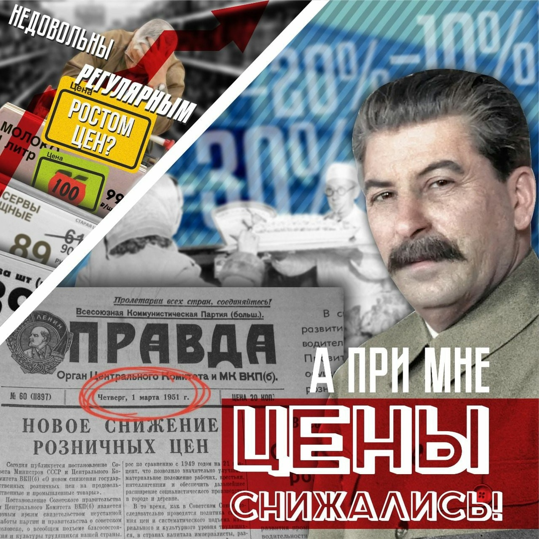 69 лет назад, 1 марта 1951 г., газета «Правда» вышла с заголовком о «Новом снижении розничных цен». Это было четвертое по счету снижение цен для советских граждан после Великой Отечественной войны. Оно стало возможным благодаря бурному развитию промышленности и сельского хозяйства. Одновременно происходил рост производительности труда и увеличение покупательной способности населения, в том числе пенсионеров. Так советское государство под предводительством И.В. Сталина заботилось о трудящихся.