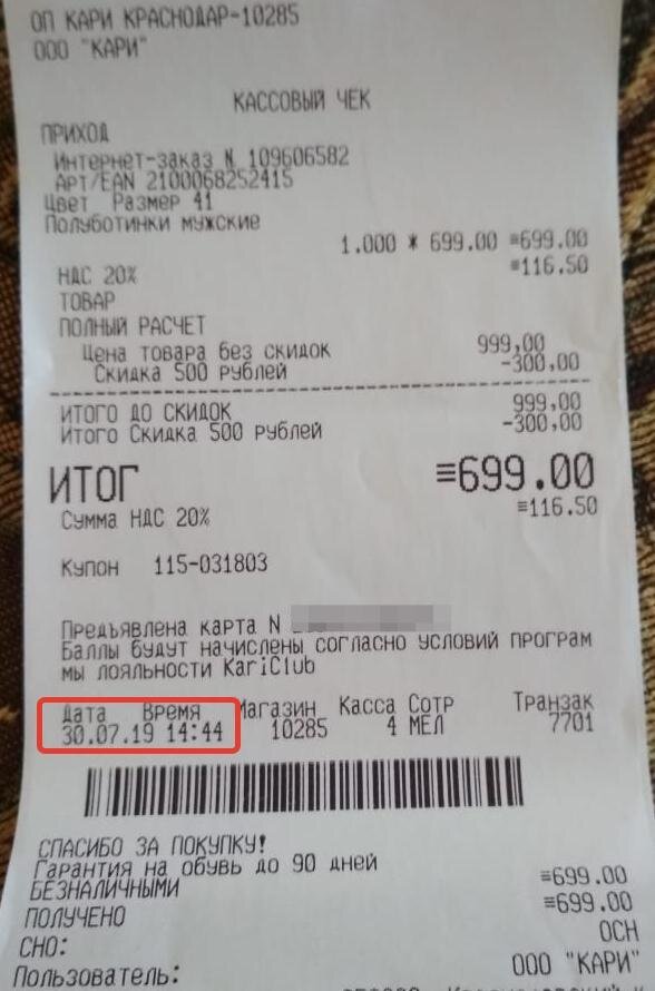 Добрый день, уважаемые читатели! 30 июля 2019 г. купил в магазине "Кари" мужские кроссовки, правда они числились по артикулу и ценнику как полуботинки мужские для активного отдыха. Но не суть, сидят на ноге отлично, удобны. По горам и лесам лазить не собирался. Просто чтобы ходить пешком по городу. Обошлись они мне в 699 рублей, по акции 999 рублей минус 300 рублей по промокоду. Честно, рассказываю, что ходил пешком аккуратно и довольно-таки часто. Все хорошо, но под конец гарантийного срока в 90 дней начали отслаиваться места крепления ткани к подошве. Решил пойти сдавать, все опасался - в чеке написано - "Гарантия на обувь до 90 дней". Пришел оформил возврат. Деньги вернули без всяких проблем, в субботу 19 октября 2019 г. оформил возврат полуботинок, во вторник 22 октября деньги зачислены на карту. ДОСТОИНСТВА: