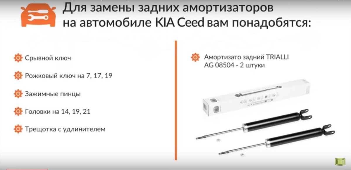 В нашем видео мы расскажем и покажем, как самостоятельно провести замену задних амортизаторов на Kia Ceed с использованием амортизаторов бренда TRIALLI. Производители рекомендуют проверять состояние амортизаторов каждые 20-30 тысяч км и при их сильном износе - менять. Но стойки могут выйти из строя еще раньше - если вы чувствуете, что: ● на ходу происходят продольные наклоны автомобиля; ● имеются следы вытекания масла амортизатора; ● подвеска жестко срабатывает при торможении; ● автомобиль подпрыгивает, чувствуются толчки; ● теряется сцепление с дорогой, требуется постоянный контроль рулевого колеса; вполне вероятно, что амортизаторы пришли в негодность. Если диагностика подтвердила неисправность, не торопитесь менять стойки в сервисе: это можно сделать и самостоятельно. В нашем видео мы расскажем и покажем, как самостоятельно провести замену задних амортизаторов на Kia Ceed с использованием амортизаторов бренда TRIALLI. Об автомобиле Мы проводим замену задних амортизаторов на Kia Ceed