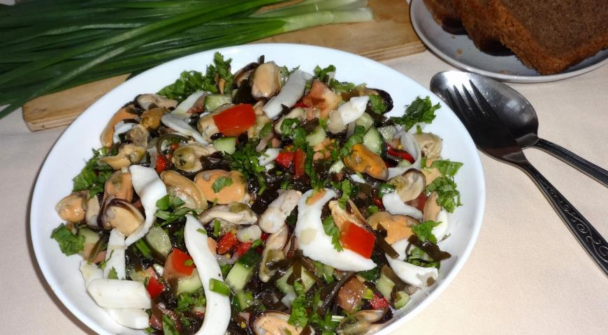 В салате вкусно сочетаются свежие овощи, маринованная морская капуста, морской коктейль и заправка из оливкового масла. Ингредиенты: Приготовление 1. Салат из маринованной морской капусты процедить от заливки. 2. Помидор вымыть, обсушить, нарезать мелкими кубиками. 3. Перец помыть, обсушить, очистить от семян, нарезать мелкими кубиками. 4. Огурец вымыть, обсушить, нарезать небольшими ломтиками. 5. Зелёный лук и кинзу помыть, обсушить. Лук и кинзу мелко нарезать в отдельные ёмкости. 6. Выложить в миску морскую капусту, нарезанные овощи, зелёный лук. Посолить, поперчить, положить зерновую горчицу, перемешать. Банку с морским коктейлем откинуть на сито и отцедить от рассола. 7. Выложить в салатник смесь овощей с морской капустой и морской коктейль. Полить салат оливковым маслом, перемешать, посыпать мелко нарезанной кинзой. Подать салат к столу. Приятного аппетита! Понравился рецепт? Ставьте лайк👍 и делитесь в комментариях своим мнением. Подписывайтесь на канал, Вас