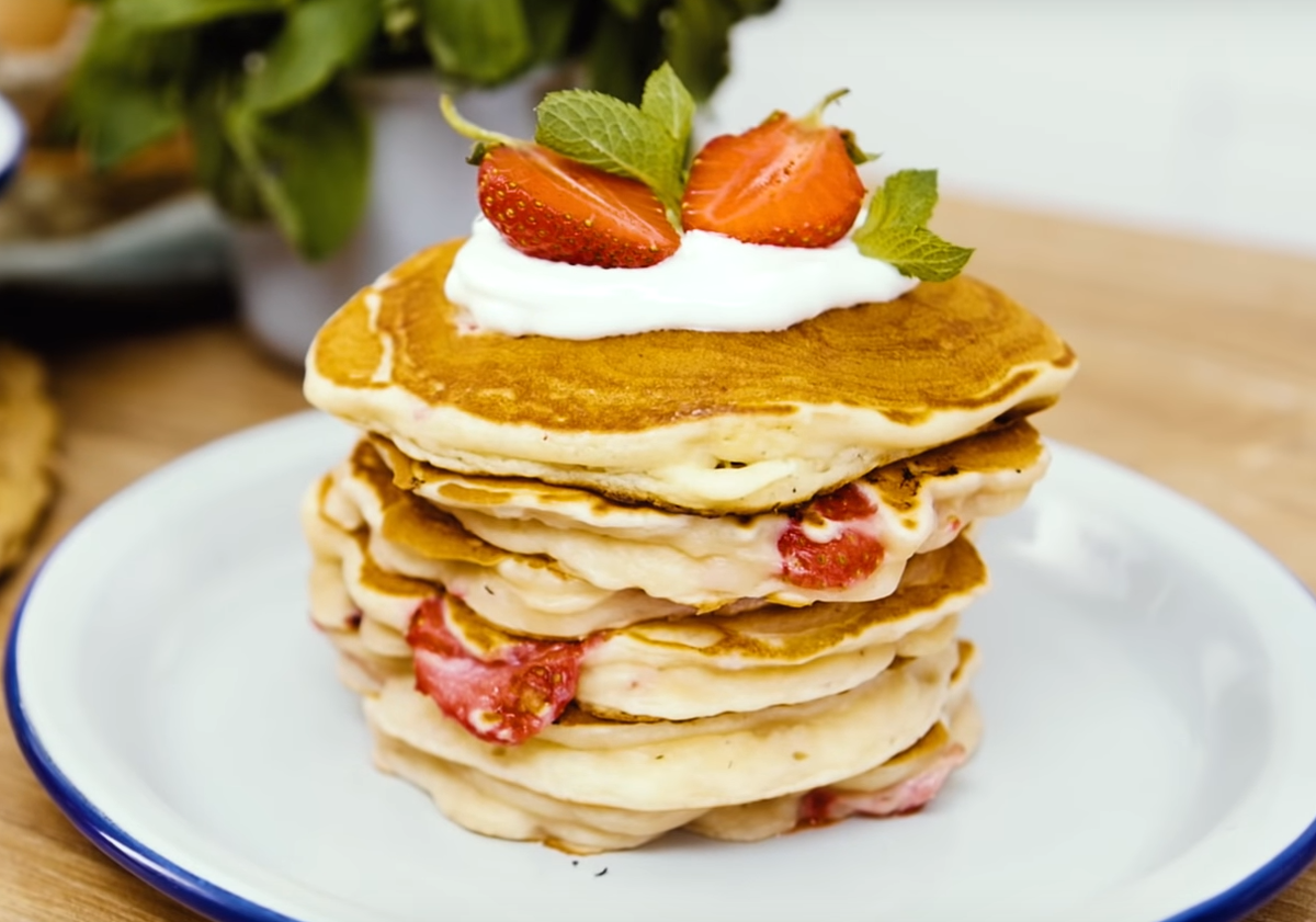 Приветствую вас, дорогие читатели ! Сегодня я поделюсь с вами рецептом невероятно вкусных клубничных панкейков, от которых вы точно будете в восторге ! Для приготовления нам потребуется : 1) 1 куриное яйцо 2) 20 грамм сахара 3) 220 миллилитров негустого натурального йогурта 4) 1 чайная ложка разрыхлителя 5) 40 грам растопленного сливочного масла 6) 160 грамм муки 7) 200 грамм клубники Смешиваем венчиком муку, куриное яйцо, сахар, натуральный йогурт, разрыхлитель и сливочное масло до однородного состояния. После добавляем половинки клубники и перемешиваем ложкой или кухонным шпателем Далее ставим на максимальный огонь сковородку и обжариваем наши панкейки Выкладываем на тарелку, добавляем сметану или варенье ( на ваш вкус ). Вуаля ! Наше блюдо готово. Смотрите, как аппетитненько и красиво получились наши панкейки. На вкус так вообще пальчики оближешь ! Если вам понравился данный рецепт, то не забудьте пост авить лайк и подписаться, ведь у меня есть для вас ещё очень много интер