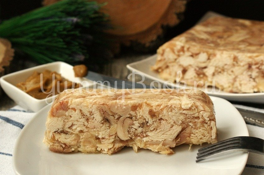 соком, выделившимся из курицы, предварительно процедив его. 4. Куриный сальтисон полностью остудить, а затем поставить в холодильник до полного застывания.