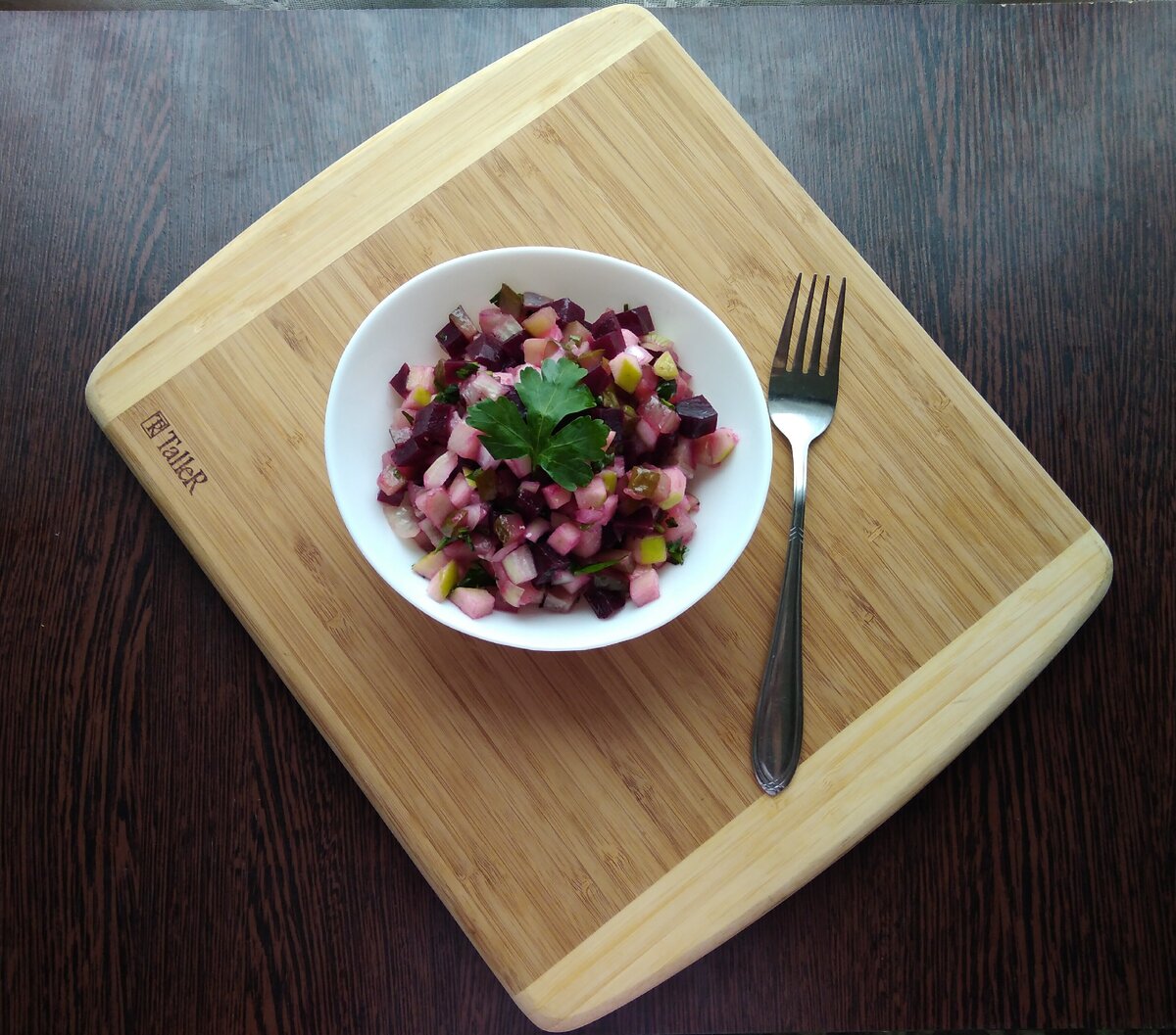 По составу салат похож на "сельдь под шубой", но по вкусу и консистенции это совершенно другой салат. Каждый кусочек сочного лука приятно похрустывает, кислые нотки яблок прекрасно сглаживает свекла, а солёные огурчики и селёдочка добавляют этому салату особый вкус. Для приготовления салата нам потребуется: Заправка: Приготовление салата: 1. Прежде всего нам необходимо сделать заправку для салата. Для этого растительное масло, лимонный сок, мёд и горчицу объедините и хорошо перемешайте. 2. Отварите свеклу до готовности, остудите, почистите. Нарежьте небольшими кубиками. 3. Яблоко помойте, удалите сердцевину. Нарежьте небольшим кубиком. Чтобы яблоко не окислилось на воздухе и не потемнело, сбрызните его лимонным соком и перемешайте. 4. Маринованные огурчики и лук нарежьте небольшим кубиком. 5. Сельдь разделайте и удалите кости. Я взяла сразу готовое филе. Нарежьте рыбу небольшими кубиками. 6. Зелень помойте и мелко порубите. 7. Все ингредиенты объедините в салатнике и полейте нашей у