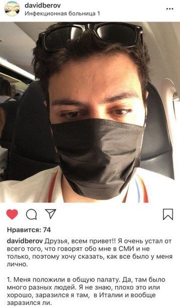 Московские врачи подтвердили первый случай коронавирусной инфекции Covid-2019. Коронавирус был выявлен у москвича, прилетевшего из Милана. Сергей Собянин заявил, что 24 человека госпитализированы и ещё 83 находятся на карантине после контактов с заболевшим коронавирусом в Москве. Речь идёт о 29-летнем сотруднике РФС Давиде Берове. Парень в середине февраля отправился в Италию кататься на горных лыжах. Вернулся 23 февраля и сразу же почувствовал недомогание. 27 февраля Давид сам отправился в больницу и сдал анализы. Его сразу же госпитализировали, но в общую палату. Вскоре врачи уверенно сообщили ему, что он болен коронавирусом. Однако спустя короткое время поправились и заявили, что нет, вируса всё-таки нет. Эти непонятки были связаны с тем, что проверка на коронавирус – трёхэтапная: и врачи ждали заключения последнего уровня – от новосибирского "Вектора". Городские власти разрабатывают серьезные меры против вируса. И речь идет о не о серьезности угрозы эпидемии. А о серьезности по