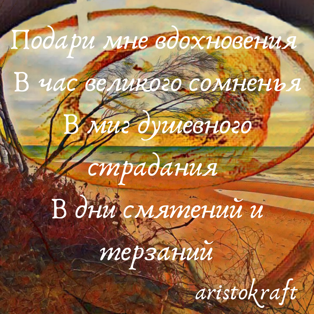 К хранителю. Подари мне вдохновения В час великого сомненья В миг душевного страдания В дни смятений и терзаний В непогоду кров одежду В холода тепла надежду Силы дай и веры в чудо И здоровья близким людям Вразуми тех кто во власти Бедным хлеб, богатым счастья Красоту живой природы Наслаждение от погоды Наважденья образ дивный Бой часов стенных старинных Страсти буйство красок цвет Жизни красочный букет Серость дней верни назад И обыденности ад Чистый лист простой бумаги Скрип пера душевной влаги Утоли печаль и грусть Силы дай пройти свой путь #aristokraft #aristopoetry