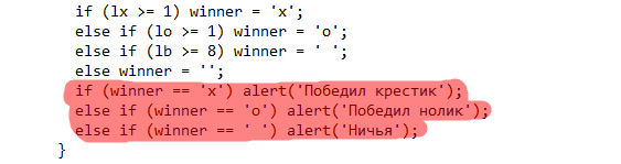 До конца остается все меньше и меньше. Уже сейчас наше приложение вполне работоспособно. Есть несколько недочетов, которые мешают свободно пользоваться игрой. Перечислим их: Пока так, разберемся с первой проблемой. Сейчас программа, определив победителя не успевает показать финальную игровую ситуацию, потому что сразу выкидывает сообщение. Давайте сделаем так: не будем показывать сообщение, вместо этого подкрасим выигрышную линию красным цветом, если игрок кликнет по ячейке - то перейдем к третьему экрану, если игрок не кликнет, то автоматически перейдем на третий экран через пять секунд. Удалим вот эти строки: Если сыграть теперь, то сообщение не появляется. Сделаем окраску выигравшей линии: То есть, мы добавляем к ячейкам выигравшей линии еще один класс, который, по нашей задумке, должен менять цвет наших фигур. Такой класс можно сделать, например, вот так: Стилевое свойство filter позволяет изменить внешний вид изображения элемента, наложив на него различные фильтры. Не будем углубл