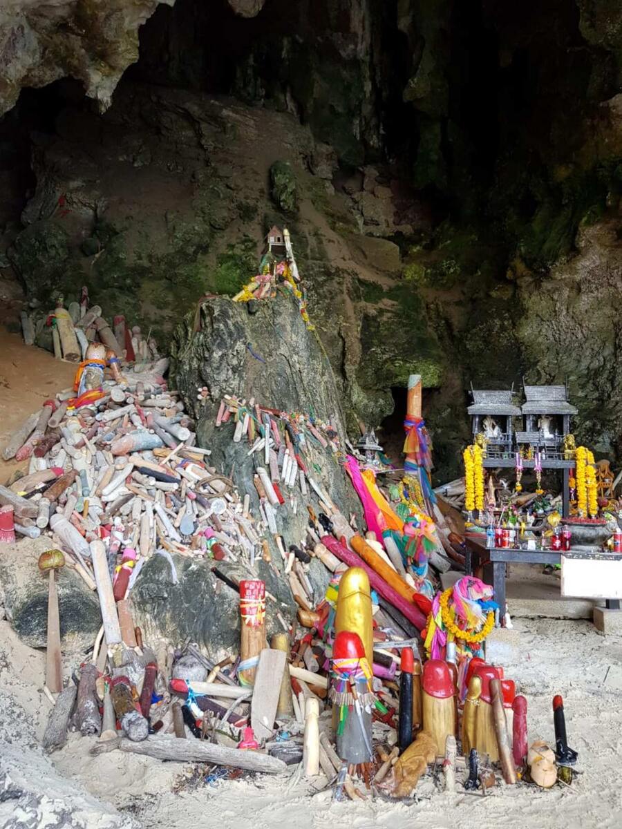 Пещера фаллосов в провинции Краби в Тайланде. Или по другому пещера принцессы. Пещера фаллосов на Краби еще называется пещера принцессы. Местные называют - пещера плодородия, местные рыбаки посещают ее, перед тем как отправиться на промысел в море. У них она является воплощением успеха мужества, а девушки женщины приходят попросить об удачном замужестве, долгожданной беременности. Сила местного суеверия очень велика. Практически всё население провинции Краби абсолютно уверены в силе духа обитающего в этой пещере и его способности исполнять любые просьбы, надо только уметь просить. И обязательно нести в виде подношения символический фаллос украшенный лентами и цветами. Если носить муляж фаллоса с собой вам кажется, совсем уж неуместными смешным попробуйте обратиться к божеству без подарков сложите ладони лодочкой возле подбородка изобразите смирение и сделайте полупоклон возможно к вам с не зайдут. Если поедете на Краби, то приятного отдыха Вам!