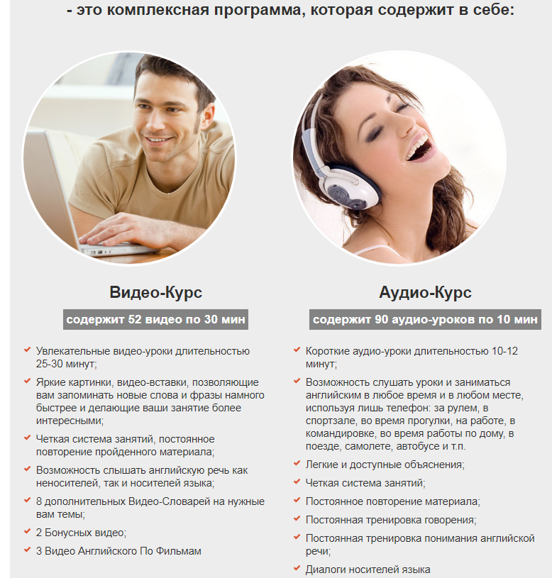 Она включает в себя два полноценных курса: Видео-Курс “Английский За 4 Недели” и Аудио-Курс “Современный Английский Для Начинающих” тем самым помогая вам одновременно “охватить” английский язык со всех сторон, используя как видео-, так и аудио-материал.