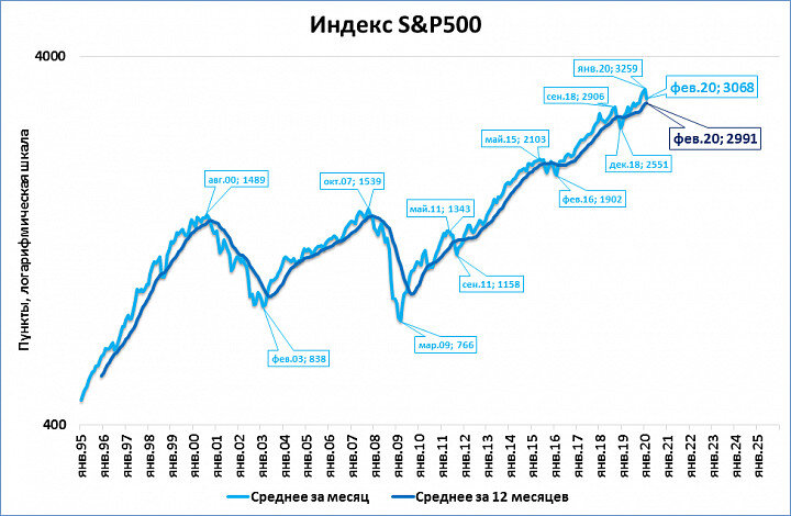 В последнюю неделю февраля индекс S&P 500 испытал одно из самых сильных падений в истории. Тем не менее, глобальную картину это пока не сильно портит. Среднее значение индекса за февраль (по формуле HLC/3) составило 3068пунктов. Это на 11% выше, чем в феврале 2019 года. И даже минимум февраля 2020 года (2856 пунктов) выше, чем индекс в феврале год назад. Другими словами, падение пока вовсе не выглядит катастрофическим. Индексу далеко не только до "медвежьего" состояния (см. густые красные "бороды" на графике и синюю линию глубоко внизу). Ему далеко даже до коррекции (см. выделенные жёлтым цветом выноски), то есть до ситуации временного падения, после которого возобновляется рост. Хотя неопределённость из-за коронавируса сейчас высока и всё может измениться. П.С. Для тех, кто использует Телеграм: Материалы этого блога можно на несколько часов (а иногда - дней) раньше прочитать на телеграм-канале "M2". В Телеграме его можно найти, введя в строку поиска @m2econ. Или воспользуйтесь ссыл
