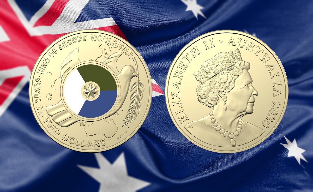 2 сентября 1945 года Вторая мировая война закончилась. Около миллиона австралийских мужчин и женщин участвовали в войне, и около 40 000 человек погибли в результате конфликта. Королевский австралийский монетный двор отмечает 75- ю годовщину окончания войны цветной монетой номиналом 2 доллара 2020 года, на которой изображен голубь мира и цвета, представляющие три австралийских войска, служивших с 1939 по 1945 год.