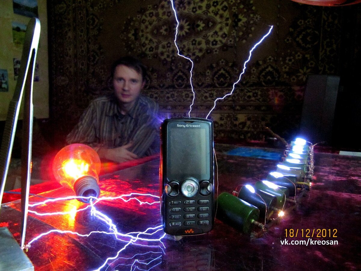 Лучше из комнаты, где будут проводиться опыты, убрать всю электронику. Разряды создают мощные электромагнитные импульсы. Телефон, клавиатура и монитор, которые показаны у меня в видео, вышли из строя и ремонту больше не подлежат! Даже в соседней комнате у меня выключился газовый котёл.