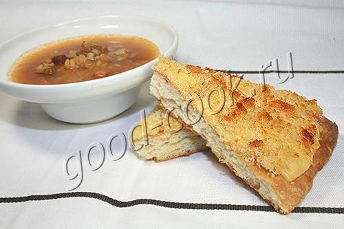 У лепёшки замечательный вкус. Мягкое пышное тесто, упругий, солоноватый слой сыра и ароматная, хрустящая верхняя корочка.