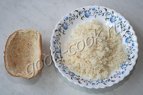 Мякоть батона мелко накрошить. Сливочное масло растопить и равномерно полить хлебные крошки. Перемешать вилкой, чтобы все крошки промаслились. Тесто