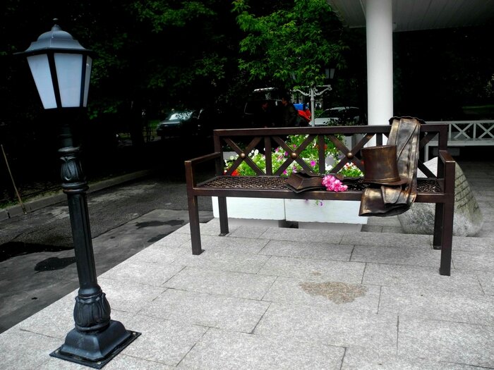 Новые скульптуры появляются в Петербурге регулярно. Памятник на фотографии совсем молодой – он появился в Петербурге 6 июня 2016 года. Бронзовая скамья, на которой аккуратно сложены такие же бронзовые плащ, цилиндр и открытая книга с пером – что же это может значить? 😊
