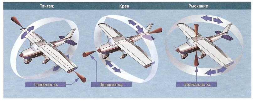 Рысканье. Вертикальная ось — ось, лежащая в плоскости симметрии самолёта и перпендикулярная его продольной оси. Вращение вокруг неё называется «рыскание» (англ. yaw). Самолёт при этом поворачивает нос влево или вправо. Управляет этим вращением руль направления (англ. rudder). Это подвижная часть вертикального хвостового оперения самолёта (киля). Отклонение руля направления вправо (если смотреть на горизонтальный самолёт со стороны хвоста) приводит к рысканию самолёта вправо, и наоборот.
