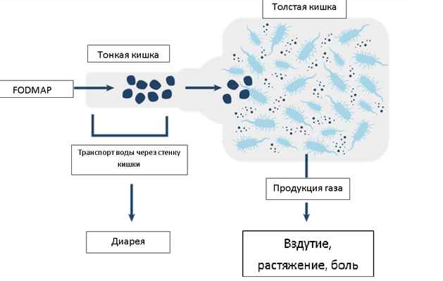 Рисунок – вероятный механизм возникновения/усиления симптомов у пациентов с СРК при употреблении пищи, богатой веществами FODMAP.