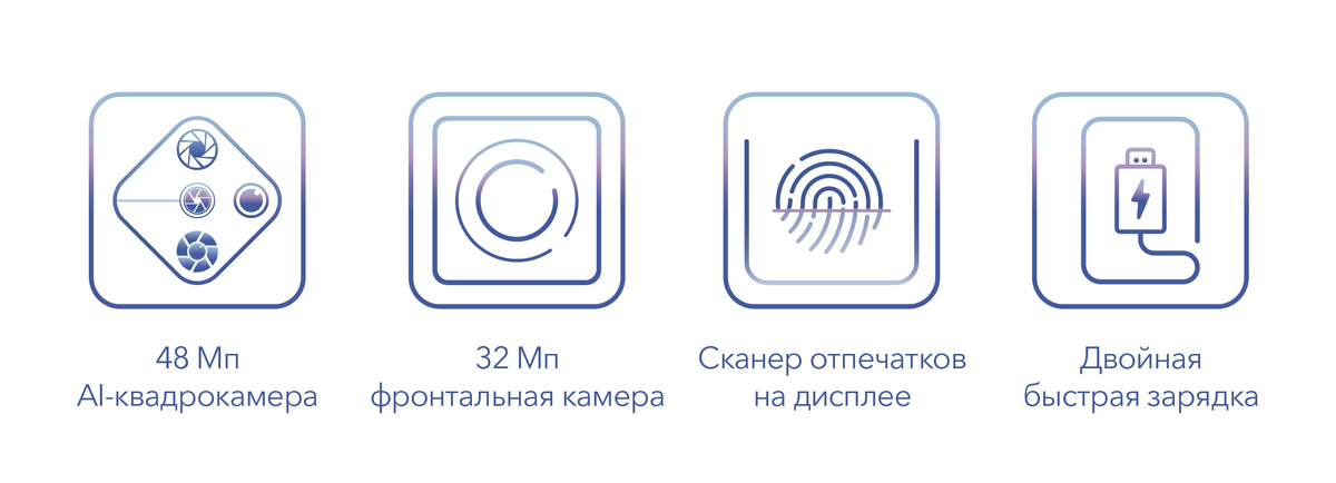 Смартфон с 48 Мп AI-квадрокамерой, 32 Мп фронтальной камерой, сканером отпечатков на дисплее, быстрой зарядкой и NFC.