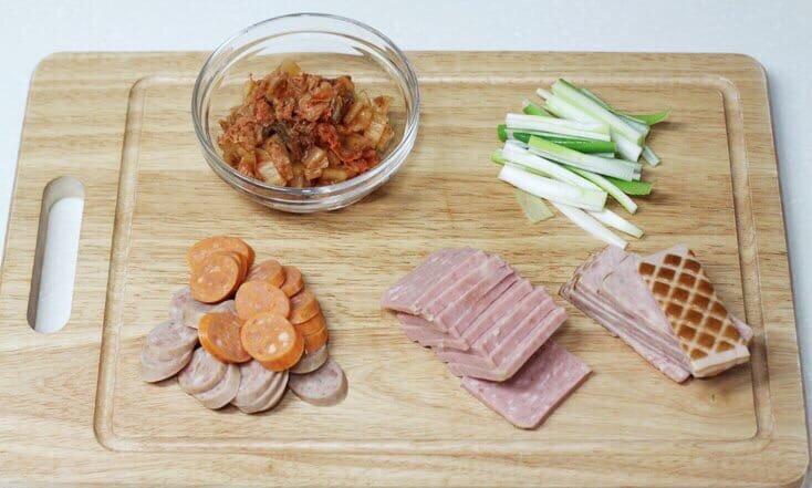 Список ингредиентов: Ветчина - пригоршня Сосиски - 2 шт Рамен - 1 шт Ричем - мягкая ветчина (리챔) - половина баночки Лук-порей - 1/2 шт Нарезанные кимчи - половина пиалки Заправка: Жгучий перец в порошке - 2 ст л Соевый соус - 1 ст л Алкоголь (любой) - 1 ст л Раздавленный чеснок - 1 ст л Черный перец - щепотка Для бульона (можно просто водой заменить): Вода - 5 стаканов Сушеные анчоусы - 10 шт Ламинария - 2 листа (5х5 см) Способ приготовления: 1. Нарезаем сосиски, ветчину и лук так, чтобы их было удобно есть. 2. Ставим вариться бульон (после закипания варим 10 минут, затем выключаем, а ламинарию и анчоусы выкидываем). В это время готовим заправку. 3. Подготавливаем основу для супа: в большую сковороду по кругу выкладываем кимчи, сосиски, ветчину и лук. В середину выкладываем заправку и заливаем все бульоном. Снова ставим на сильный огонь. 4. Ждем, пока бульон снова закипит и немного варим ветчину и лук (вода должна чуть выкипеть). После этого добавляем рамен. 5. Как только